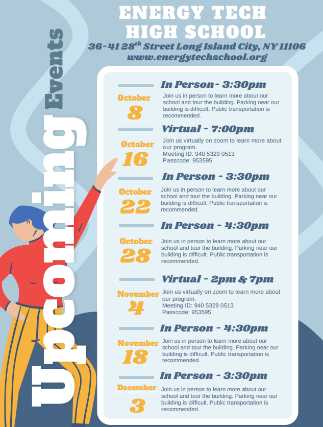 Learn about our unique early college and career pathways, meet our dedicated teachers and staff. For dates, check the flyer for upcoming Open Houses!
